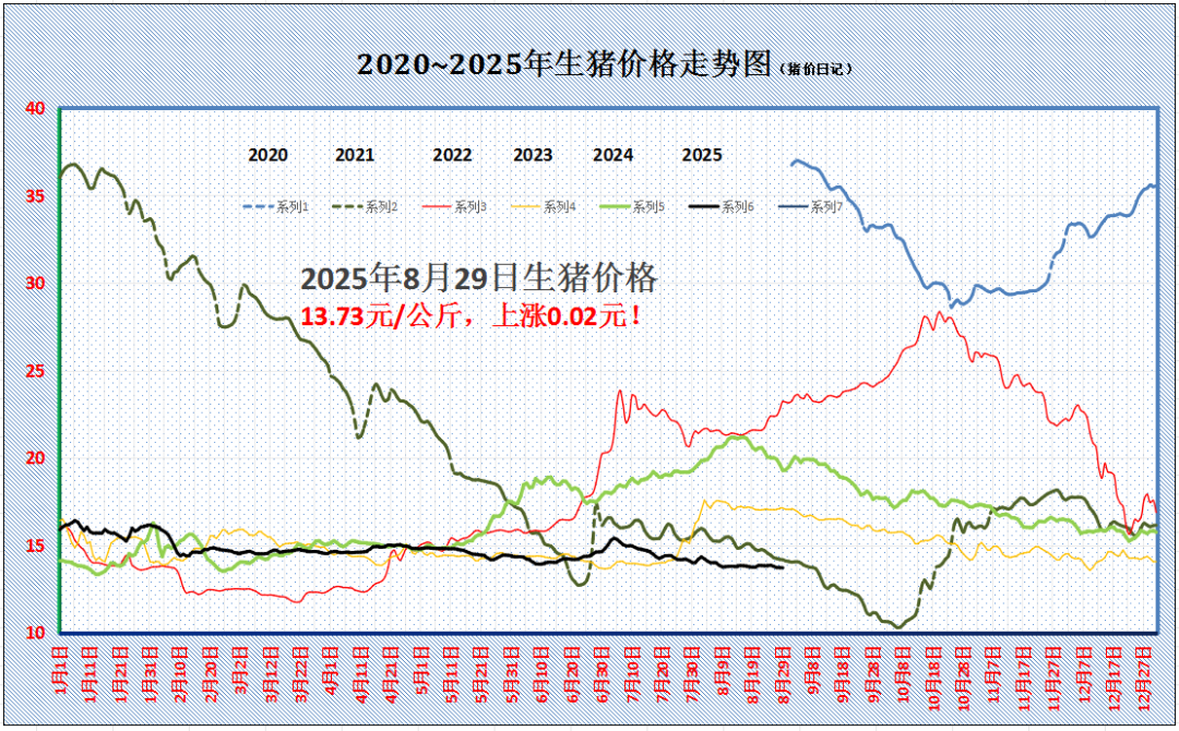 时光飞逝,转眼,8月渐入月末。近期,国内生猪市场,猪价以震荡下行为主,虽然,月初猪价短暂回升至14.33元/公斤。但是,碍于8月供需矛盾激化,标猪供应过剩,中大猪出栏增加,而需求承接不足,在产销错配下,猪价呈现单边下降的走势!昨日,国内标猪报价触底13.71元/公斤,猪价创下了2025年新低,不过,由于市场底部支撑转强,此番猪价下跌告一段落,8月末,猪价上涨“猛抬头”,猪价或将迎来季节性上涨的拐点,年内低值或确定!